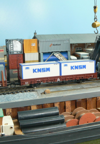 Voor inzet in tijdperk IV heeft de Oostenrijkse fabrikant een NS-rongenwagen type Kbs beladen met twee 20-voet containers van de KNSM in H0 uitgebracht. Opgegroeid in een KNSM-gezin zag Rob Mooij direct een toepassing voor zijn kadespoor.